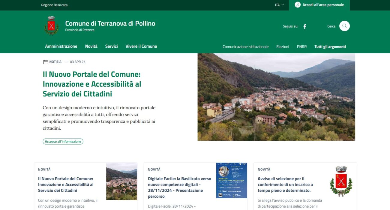 Servizio: Sito web Cliente: Comune di Terranova di Pollino Data: 2025 Sito web: https://www.comune.terranovadipollino.pz.it Visita il sito Il progetto Con un design moderno e intuitivo, il rinnovato portale del Comune di Terranova di Pollino garantisce accessibilità a tutti, offrendo servizi semplificati e promuovendo trasparenza e pubblicità ai cittadini. Il [...]